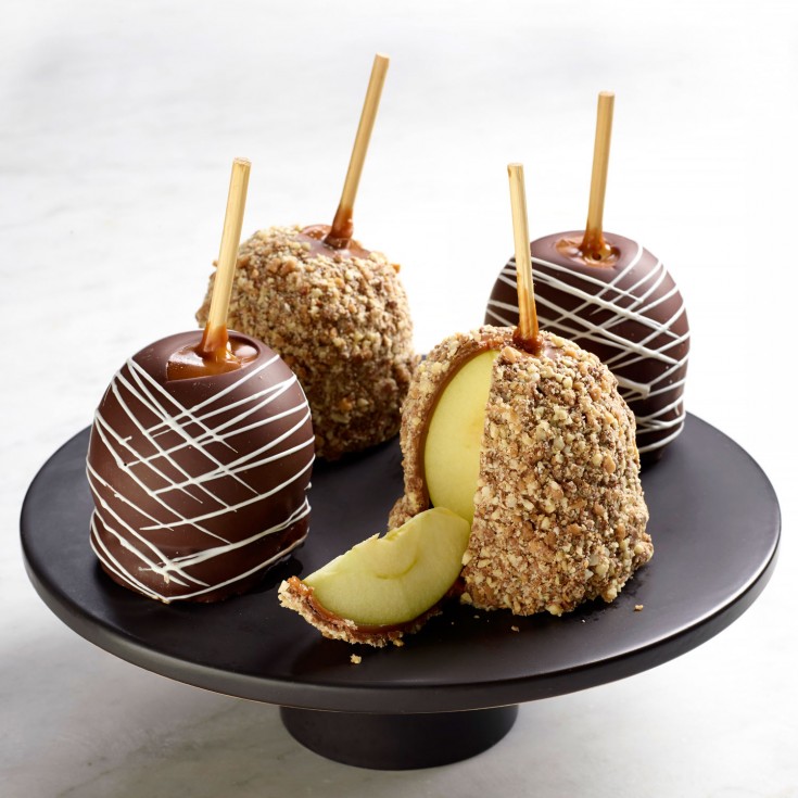 Crispy, juicy, just-picked apples get the double-dip treatment-first in rich, creamy caramel, then in luscious chocolate. Enjoy two Milk Chocolate and Toffee Caramel rolled in toffee bits and two Dark Chocolate and Caramel topped with a white chocolate drizzle. USA